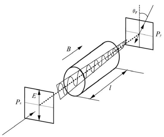 The principle of FADOF is based on the combination of anomalous scattering, the Faraday effect, and the zeeman effect []. The light passes through the first polarizer, Px and becomes linearly polarized in the horizontal direction. This linearly polarized light can be thought of as the superposition of two equal-amplitude beams of left-handed and right-handed light, relative to the direction of the magnetic field. Under the action of the magnetic field, the phase difference between left-handed and right-handed polarized lights is caused by their different propagation speeds within the atom cell. When the two lights coming out of the atom cell are superimposed again, the polarization direction of the linearly polarized light is rotated by an angle relative to the polarization direction when incident from the Px plane (Figure 2). If this angle happens to be an odd number of 90 degrees, then the combined linearly polarized light is vertical, and it can be seen through the second polarizer Py.