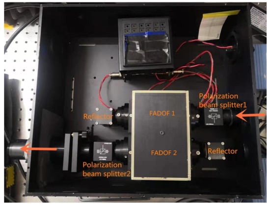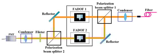 The back-scattered photon signal received by the optical fiber is collimated through the focusing system and enters the first polarization beam splitter to separate the signal light of different polarization states. The transmitted signal enters the first FADOF, and the reflected signal enters the second FADOF through the laser mirror. In this process, while the wavelength of most broadband background light is not able to resonate with the transition level of the atoms in the FADOF, the narrow band resonance fluorescence is able to resonate and therefore generate Faraday rotation of the polarization plane, so the polarization states of the signals passing through the two FADOFs are exactly opposite. The signal passing through the first FADOF is reflected from the laser mirror to the second polarization beam splitter, then reflected to the focusing lens, and then enters the photomultiplier. The signal passing through the second FADOF is transmitted to the condenser through the second polarization beam splitter and enters the photomultiplier tube. At this time, the backscattered signal received by the optical receiving system is collected by the photomultiplier tube in preparation for the next. For dual-channel FADOF, some tests have been done by Yang [] with a potassium cell. Since the potassium FADOF works in the same way as the sodium FADOF, we can learn something from this test. In the experiment, firstly, a laser beam incident into dual-channel FADOF, a laser absorber was used to block any channel of a dual-channel FADOF separately, and a detector was used to measure the light energy of each channel respectively and convert them into the voltage value at the same time. The results showed that the voltage of the two channels were basically the same. Secondly, we removed the absorber and opened both channels; the voltage was nearly twice that of a single channel. These results show that the two polarization components of the signal light can pass through the dual-channel FADOF at the same time, and the improvement of efficiency of dual-channel FADOF to one FADOF was 84.5%.