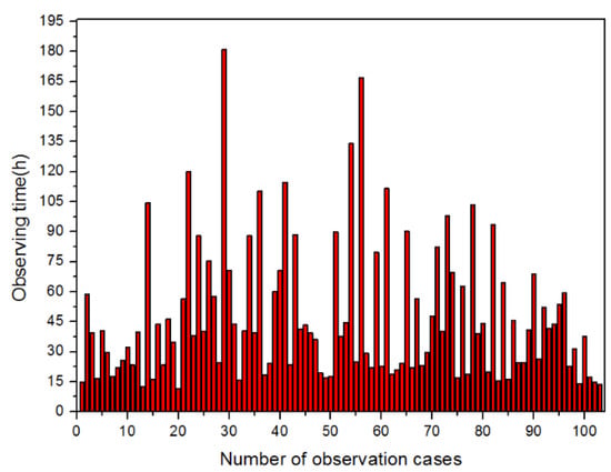 The diurnal sodium fluorescence lidar system at Beijing Yanqing station was completed in April 2014 and thereafter operated in clear weather and the dual-channel FADOF remained in the signal detection system through the whole operation. During the observation period from April 2014 to July 2017, there were 103 cases of continuous daytime observation, totaling 4870 h. The duration of each observation is shown in Figure 5. Of these, there were 71 cases with observation time exceeding 24 h, 33 cases exceeding 48 h, 18 cases exceeding 72 h, 10 cases exceeding 96 h, and 4 cases exceeding 120 h; the longest observation time reached 181 h.