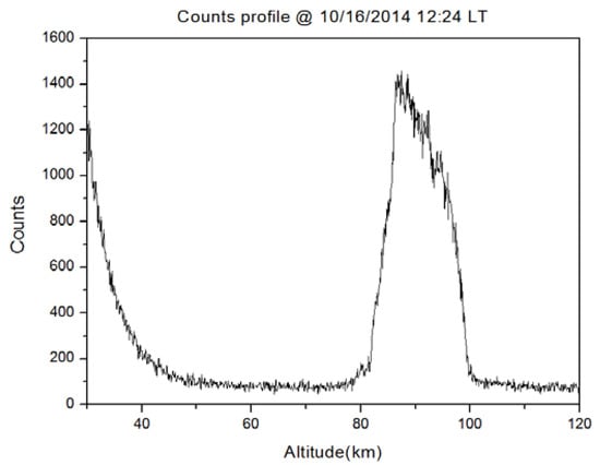 Figure 6 presents the original back-scattered photo of sodium lidar at 12:24 Local Time on 16 October 2014, in which the spatial resolution was 96 m and the temporal resolution was 2.8 min. The background photon number was approximately 75, with 1466 signal photons, and the SNR reached 19:1. Compared with the detection results of the first FADOF developed by WIPM, which had a time resolution of 2.8 min, spatial resolution of 200 m, and a SNR of 1~2, this diurnal sodium fluorescence lidar system has reduced the background light noise, greatly improved the SNR, and achieved long-term continuous observation.