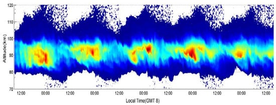 Figure 7 shows the continuous diurnal variation of the sodium layer at Beijing Yanqing lidar station from 13 October, to 18 October 2014. The observation lasted up to 120 h and covered five complete diurnal cycles of the sodium layer. It shows that the sodium layer structure varied with LT periodically, with maximum of sodium density near 87, 93, 95, 90, and 88 km. It shows a 24 h periodic fluctuation in the diurnal variation of sodium layer density [].