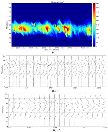 Several times during full-diurnal cycle observation, a phenomenon, known as the sporadic sodium layer (Nas), was observed during the day. Figure 8 shows the unique and rare evolution of the density profile of the sodium layer with time and altitude from 2 November to 5 November 2014, featuring a total continuous observation duration of 87.9 h, time resolution of 16.7 min, and spatial resolution of 96 m. Additionally, on 3 and 4 November, two consecutive Nas events were emergent during the day (Figure 8a, black box), and demonstrated the evolution process of its breaking form (Figure 8b,c). On 4 November, the Nas lasted until November 5 at 6:30 LT in the morning. Among them, on 3 November 2014, the duration of Nas ranged from 13:51 LT to 19:16 LT, and the peak density of this event reached its maximum at 15:50 LT (approximately 10,126 cm−3), and the corresponding peak altitude was 94 km. The ascending time was 120 min, the descending time was 206 min, and the descent speed of the Nas’ layer was 0.32 m/s. In this case, the ascending time was less than the descending time. On 4 November, the duration of Nas ranged from 14:47 LT to 16:50 LT, and the peak density of this event reached its maximum at 16:16 LT. The peak density was 8445 cm−3, and the corresponding peak altitude was 94 km. The Nas event on 4 November featured a longer, ascending time of 89 min, a shorted descending time of 34 min, and a descent speed of 0.23 m/s.