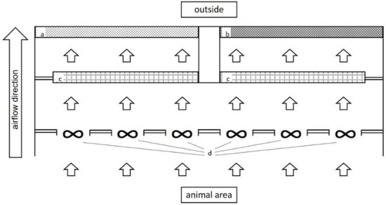 Livestock facilities contribute considerably to anthropogenic ammonia emissions. In addition, odorous emissions affect the surroundings, especially of poultry housing facilities, so that farmers are challenged not only by environmental issues concerning their farms’ emissions, but are also faced with negative attitudes of residents towards their farms. Residents often feel bothered by odours which originate from agriculture. According to the European Union emission inventory report 1990–2017 [1], 92% of the EU ammonia emissions in 2017 originated from agriculture. The main contributors were Germany, France and Spain. Besides ammonia, odorous emissions also play a major role, especially those originating from poultry housing: research undertaken by Valli et al. [2] showed that compared to pigs and cattle, laying hens and broilers have the highest odorous emissions per animal live weight unit.