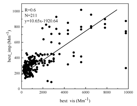 In this study, two methods were used to calculate bext. One method used the visibility data, which were converted to bext using the Koschmeider equation [43]: