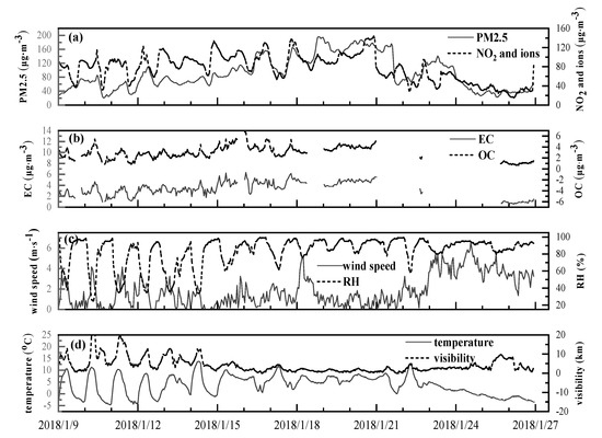 According to Figure 2, the value of PM2.5 mass concentration was moderately low, with an average of 58.9 μg⋅m−3 before 8:00 on 14 January. Excellent and good days were observed during this period. Both the visibility and RH were relatively high, and average values of 7.4 km and 68.9% were observed, respectively. The temperature was as low as 2.8 °C. The mean wind speed was 1.3 m⋅s−1 on average, and the maximum was 4.1 m⋅s−1. The mean values of light scattering components (OC, NO2, and water-soluble ions) and light absorbent components (EC) were 91.5 μg⋅m−3 and 2.7 μg⋅m−3 respectively.