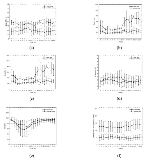 Diurnal variations of babs (a), bscat (b), bext (c), wind speed (d), relative humidity (RH) (e), and PM2.5 (f) on clean and polluted days.