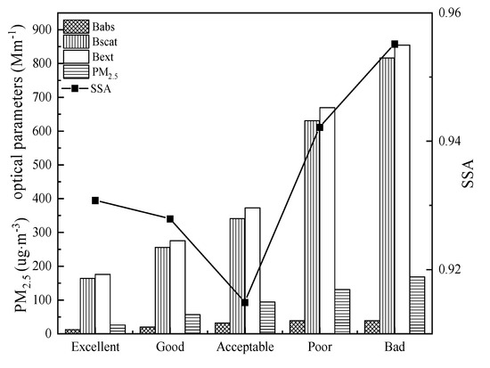 According to Figure 4, PM2.5 mass concentrations increased with pollution levels. The average mass concentrations of PM2.5 were 25.95 μg⋅m−3, 56.53 μg⋅m−3, 93.83 μg⋅m−3, 130.9 3μg⋅m−3, and 168.43 μg⋅m−3 on excellent, good, acceptable, poor, and bad days, respectively. The high levels of PM2.5 led to a rapid increase of bext, the value of which was 854.72 Mm−1 on bad days, which was 4.86, 3.1, 2.29, and 1.28 times that on excellent, good, acceptable, and poor days, respectively. The value of bscat was 816.36 Mm−1 on bad days and was 4.98, 3.19, 2.19, and 1.29 times that on excellent, good, acceptable, and poor days, respectively. The value of babs was 31.72 Mm−1 on acceptable days, which was 1.6 times that on good days. However, as pollution levels continued to increase, the value of babs did not change substantially and was 38.74 Mm−1 and 38.36 Mm−1 on poor and bad days, respectively.