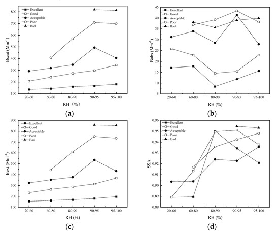 The babs showed a clear relationship with RH only on excellent and good days (Figure 5b). On excellent and good days, babs decreased with the increase of RH when RH was less than 90% but grew with the increase of RH when RH was more than 90%. The values of SSA under all pollution levels were low when RH was less than 80%, which means the contribution of scattering to light extinction was low (Figure 5d). The maximum of SSA on excellent and good days appeared at the RH range value of 80–90%, while the maximum on acceptable and poor days appeared at 95–100%.