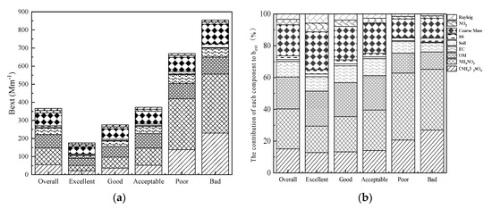 According to Figure 6a, the value of bext increased with the level of pollution. The value of bext was 854.7 Mm−1 on bad days and was 4.9 and 2.3 times that on excellent days and overall, respectively. In addition, the contribution rate of each chemical component to bext changed as the pollution level increased. OM was the largest contributor to bext on excellent days, accounting for 22.1%, and NH4NO3 and (NH4)2SO4 accounted for 16.7% and 12.8%, respectively. The contribution of NH4NO3 and (NH4)2SO4 to bext increased with pollution level. NH4NO3 contributed the most to bext on poor days, accounting for 42.1%. It was followed by (NH4)2SO4, which accounted for 20.7%. The contribution of OM decreased to 12.5%. The contribution of NH4NO3 to bext decreased slightly from poor days to bad days, but it was still the largest contributor. NH4NO3 was the largest contributor to bext on bad days, accounting for 38.2%, followed by (NH4)2SO4 (27.0%), and the contribution of OM to bext decreased to 10.9%. EC, sea salt, soil, coarse mass, NO2, and Rayleigh made a minor contribution, together accounting for 23.9%.