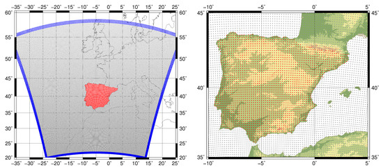 The domain is centered over the IP, but it also covers much of western Europe and northwestern Africa. A mask over the IP was defined in order to highlight the grid points included in the study (in red in both panels of Figure 1). Taking into account previous studies [62,63], the configuration of the domain prevents border effects to appear in the study region and mesoscale systems can be freely developed. Both simulations have 51 vertical levels and present a spatial resolution of 15 km. The outputs from the model are stored every 3 h in both experiments.