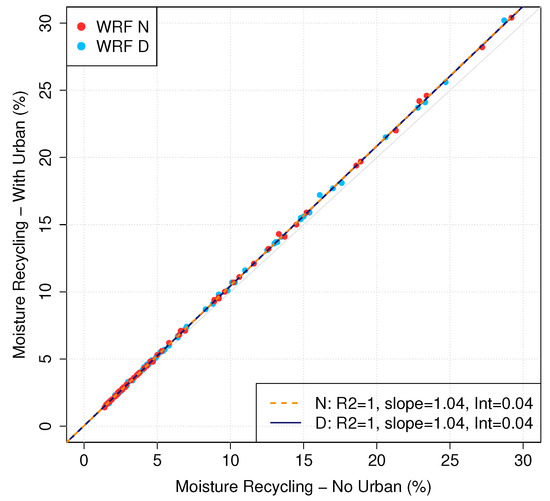 Once the definition of the moisture recycling is stated, we can start the analysis of the data. From previous studies of the authors [73], we know that WRF is not able to simulate correctly the evaporation over grid points defined as urban or built-up in the Noah land surface model. This is why we need to check whether considering these points in the analysis can trigger a bias in our results or not. To do so, we compare the areal mean of the monthly values of moisture recycling for both simulations (including or not the urban points) and we calculate the linear model between both values. If the results do no significantly differ, we will consider all the grid points included in the mask over the IP in order to provide a more complete study.