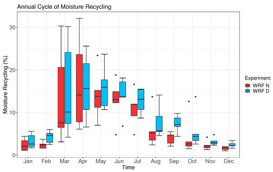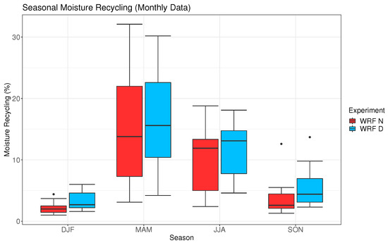If we compare both simulations, clear differences appear during summer and autumn. The moisture recycling values are smaller for the simulation without data assimilation, suggesting that the soil is really dry and that the 3DVAR data assimilation is able to correct this bias. The results corresponding to the soil moisture in the upper layer of the soil (see Figure S1 in Supplementary Materials) support this conclusion. If the mean values of each month are plotted instead of the variability of the monthly values as in Figure 3, the peak of the moisture recycling is observed in April for both simulations (16% and 17% for WRF N and WRF D, respectively). However, in the experiment without data assimilation, a secondary maximum is observed in October (mean value of 4.96%, while for September is 3.28% and 2.86% for November). According to previous studies [39], this maximum can be related to an increase in the number of convective events in the Mediterranean facade during late summer.