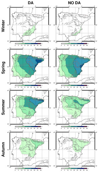 If we focus on the seasonal patterns of moisture recycling, the heterogeneity of the IP is highlighted. In winter, the moisture recycling is confined to the southeastern corner of the IP with values up to 10%. In spring, the values are higher towards the Mediterranean coast, reaching values up to 25 or 30%. For the simulation including data assimilation, the maximum is in the northeastern corner of the IP, while the maximum is located further south for the simulation without data assimilation. The differences between simulations are remarkable in summer due to the differences in the soil moisture of the land surface model. In the case of the simulation without data assimilation, the soil is dryer and the moisture recycling is not so intense as in the simulation including data assimilation. Autumn is a transition season between summer and winter, and the moisture recycling reaches values around 10% in the northeastern corner of the IP.