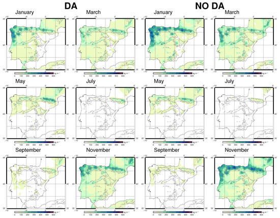 The spatial distribution of moisture recycling for both simulations in winter (DJF), spring (MAM), summer (JJA), and autumn (SON) is presented in Figure 4. Additionally, the monthly accumulated precipitation maps are presented in Figure 5. Soil moisture maps can be found in the Supplementary Materials (see Figure S1), and they present a similar spatiotemporal variability to precipitation. The mean moisture transports over the IP (see Figure S2 in Supplementary Materials) show zonal flows, and the main difference between experiments is that the simulation with data assimilation produces slightly less intense flows than the one without.