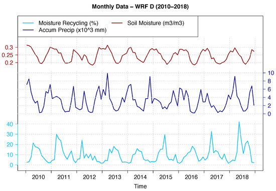 Finally, due to the good capacity of the simulation including data assimilation to correct to some extent the bias in soil moisture observed between both simulations (presented in this study), and due to its ability to reproduce the spatial and temporal evolution of variables involved in the water balance as presented in previous studies by the authors [73,74,76], this simulation was extended until 2018. This is why this simulation (WRF D) was chosen to show the interannual variability of areal mean moisture recycling over the IP for the period 2010–2018. The temporal evolution can be found in Figure 7, along with those for areal mean soil moisture and accumulated precipitation.