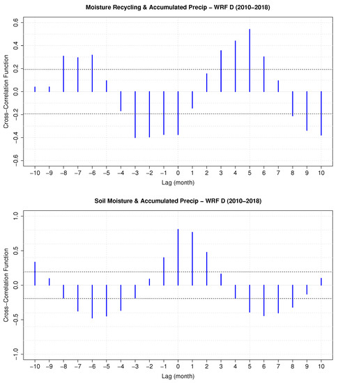 As shown in Figure 7, there exists a clear lead–lag relationship between precipitation and soil moisture and recycling. Thus, in order to determine the lag between each component involved in the moisture recycling, a Cross-Correlation Function (CCF) based analysis has been performed for each combination of the variables up to ten months. This analysis has covered the extended period simulated with WRF D (2010–2018—Figure 8), and also for both WRF simulations (Figure S3 in Supplementary Material) during a common period (2010–2014). Thus, we compare the behavior of lead–lag relationships with and without data assimilation.