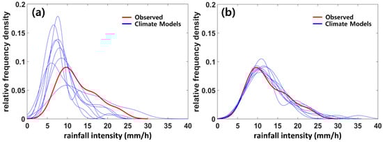 Frequency distribution of annual maximum rainfall intensity for duration 12 h at the Seoul site. The blue lines are empirical distributions of (a) un-bias-corrected and (b) bias-corrected annual maximum rainfall intensity time series derived from various Global Climate Model (GCM)/Regional Climate Model (RCM)/Representative Concentration Pathway (RCP) combinations, and the red line represents the empirical distribution of the observed annual maximum rainfall intensity time series.
