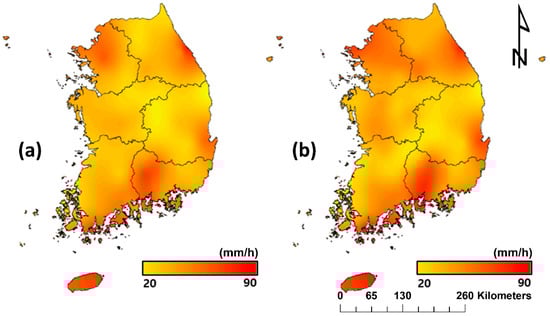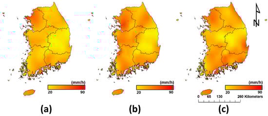 Gumbel distribution was applied as a probability density function to estimate the design rainfall intensity. In Korea, the Gumbel distribution is used in principle to maintain the consistency of design practices [67]. Figure 4, Figure 5 and Figure 6 show the spatial distribution of design rainfall intensity derived from observations and future design rainfall intensity derived from several GCM/RCM/RCP combinations.