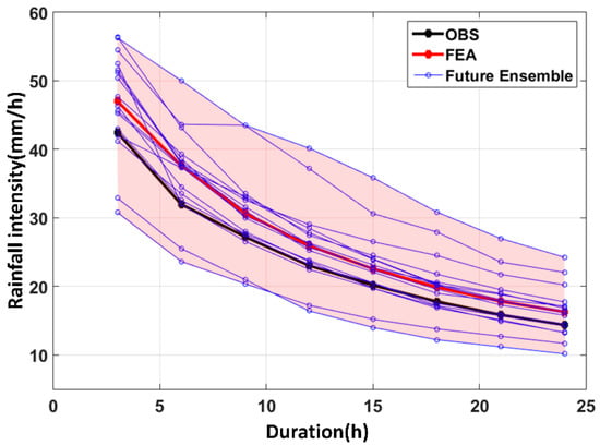 where FEA(T,d) is the median of future design rainfall intensity ensembles of the return period T years and the duration d hours, and OBS(T,d) is the estimated design rainfall intensity from the corresponding observations. Figure 7 shows 16 future design rainfall intensity ensembles and their FEA at the Haenam site. For reference, the rate of change of the future design rainfall intensity for the return period 30 years and duration 3 h estimated from 16 ensembles at the Haenam site was calculated to be 10.7%. This means that the design rainfall intensity may increase by about 11% compared with the present.