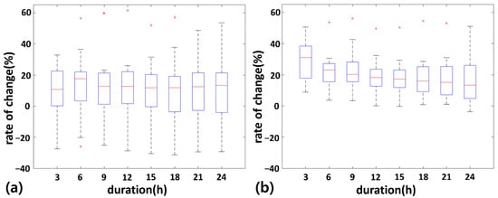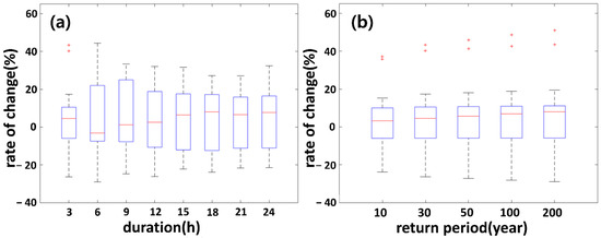 Boxplot of rates of change (a) for duration (return period 30 years), and (b) return period (duration 3 h) at the Seoul site.