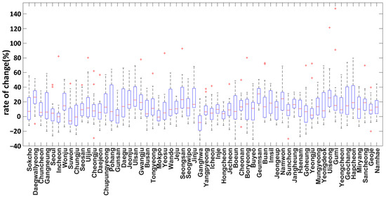 Boxplot of rates of change for 16 future design rainfall intensity ensembles with return period 30 years and duration 3 h at all 60 sites in Korea.