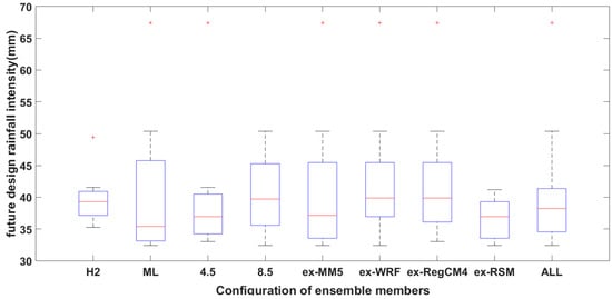Figure 10 shows a boxplot of the rate of change for how ensemble members are constructed. In the configuration of ensemble members classified by GCM as H2 and ML in the figure, the rate of change and uncertainty of future design rainfall intensity were estimated by using 8 future ensembles for each GCM. In the configuration of the ensembles classified by the RCP, the rate of change and uncertainty of the future design rainfall intensity were estimated by using 8 future ensembles for each RCP as in the configuration separated by GCM. Analyzing the rate of change and uncertainty of future design rainfall intensity using ensemble members identified by RCM needs to be examined in a slightly different way. Since there are 4 RCMs applied in this study, the rate of change and uncertainty of future design rainfall intensity are calculated using only 4 ensemble members when analyzed by RCM. Since the number of ensemble members for uncertainty analysis was considered to be insufficient, this study constructed ensemble members excluding ensembles derived from one specific RCM (for example, MM5) among all ensembles derived from all RCMs (for example, ex-MM5 in the figure). If the uncertainty in the ensemble configuration where the MM5 is excluded is lower than the uncertainty in the configuration in which all the RCMs are applied, this means that the uncertainty is greatly increased due to ensemble members derived from MM5. Of course, such a method has the disadvantage that it cannot directly represent the rate of change and uncertainty of RCM, but it can be indirectly grasped the contribution of uncertainty by RCM.