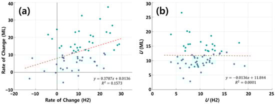 Comparison of correlations for which GCM was applied (duration 3 h and return period 30 years) in terms of (a) rate of change, and (b) its uncertainty . The red dashed line is the regression line, and its regression formula and decision coefficients are shown at the bottom right of the corresponding figure.
