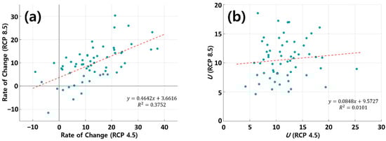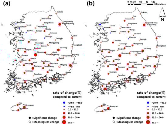 Figure 13a consists of 29 sites with significant increases, 26 sites with insignificant increases, and 5 sites with no significant decreases. On the other hand, in Figure 13b, which is the result of removing one particular RCM that causes large uncertainties, 13 sites were additionally identified as sites that are expected to show a significant increase, and one site has been added to a site where FEA is significantly decreased. In this way, since selective application of RCMs at each site effectively utilizes the future climate data obtained from various climate models and at the same time reduces the difference between the ensembles derived from various future climate data, it is expected that it will provide more reasonable and persuasive results when establishing climate change adaptation policy.