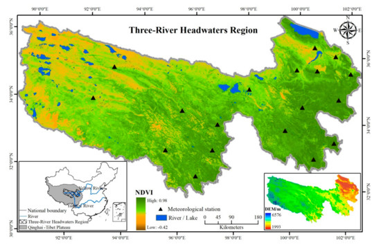 The Three-River Headwaters Region (TRHR) comprises the headwaters of the Yellow, Yangtze, and Lancang rivers in the hinterland of the Qinghai-Tibet Plateau of southern Qinghai Province, China, from 31°39′ N to 36°16′ N and 89°24′ E to 102°23′ E (Figure 1). It is known as the “Asia water tower” due to the multiple large rivers originating in the region [27,28]. The total land area is over 350,000 km2 and elevations range from 3450 m to 6621 m with an average of more than 4000 m. The area is characterized by a cold and dry climate with average annual temperatures below 10 °C and annual precipitation varying between 262.2 mm·year−1 and 772.8 mm·year−1 from the west to the southeast. The main vegetation type is alpine grassland, including meadow and steppe [29]. Natural ecosystems in the region are relatively fragile and highly sensitive to climate change [30], which causes serious disturbances to the structure and function of these ecosystems and poses a threat to ecosystem security [31]. The high heterogeneity of the Three-River Headwaters Region provides a rigorous test of the method proposed in this paper as well as preliminary results for future climate change research in the region.