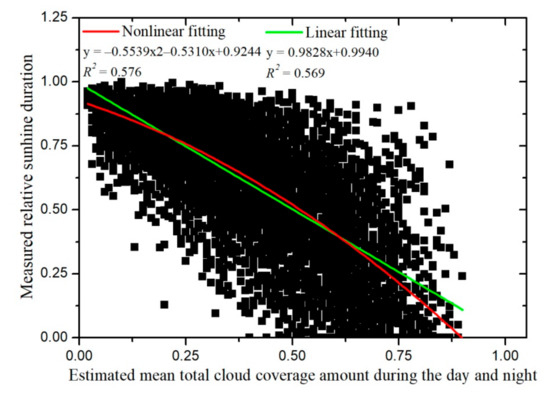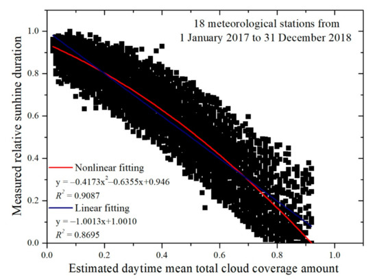 Previous researchers found that there is a linear or non-obvious non-linear relationship between relative sunshine duration and mean cloud cover or cloud types during the day and night [14,21,25], while the proposed method in this paper showed that a significant non-linear relationship exists between relative sunshine duration and daytime mean total cloud coverage amount, especially for the spring and winter seasons. Consequently, using seasonal-based equations for estimation provides estimates more consistent with ground observation data. Similarly, the use of daytime mean total cloud coverage amount in this paper, rather than the average total cloud coverage amount during the day and night, is the more appropriate choice. Figure 8 shows the relationships between measured daily relative sunshine duration for the 18 meteorological stations for 2017 and 2018 and the average total cloud coverage amount during the day and night calculated based on Equation (6) with parameters j and k set to 0 and 23, respectively. It is apparent that the relationship, either linear or non-linear, is relatively weak, with correlation coefficients less than 0.6. Sunshine duration is mainly affected by differences in the total cloud coverage amount between sunrise and sunset. The differences in total cloud coverage amount at night will not affect sunshine duration. Since the World Meteorological Organization (WMO) defines sunshine duration as the number of hours for which the direct solar irradiance is above 120 W/m2, while the direct solar irradiance at night is significantly less than 120 W/m2. In addition, compared with the sunshine duration estimation method based on hourly cloud classification of geostationary meteorological satellite [9] (name, cloud classification-based method). The maximum value of R2 between the sunshine duration estimate based on seasonal-based equations proposed in this paper and the sunshine duration measured is 0.951. Except for the tuotuohe station, the R2 value of all other ground stations is greater than 0.900, and the RMSE value range is from 0.779 to 0.979 h/day, while the range value of R2 for the cloud classification-based method is from 0.850 to 0.925 h/day, and the RMSE value range is from 1.105 to 1.626 h/day. This indicates that the proposed method in this paper is better than the cloud classification-based method due to the same cloud type in a region that may differ in total cloud amount.