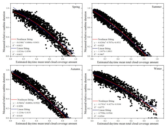 Fitting the data over annual periods, as in Figure 2, may obscure likely seasonal variation in cloud coverage and its relation to sunshine. Consequently, Figure 3 shows the relationship between daytime mean total cloud coverage amount (fccom) and relative sunshine duration for each of the four major seasons (spring, summer, autumn, and winter) for all 18 meteorological stations for the years 2017 and 2018. As with the annual data, a nonlinear relationship is evident, especially in the spring and the winter. Consequently, quadratic models rather than linear models better fit the data. Based on the least square method using SPSS and Origin statistical analysis tools, the optimal fit coefficients (a1, a2, a3, am, b1, b2, b3, bm, and c) for Equation (7) are shown below for each season.
