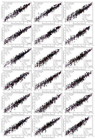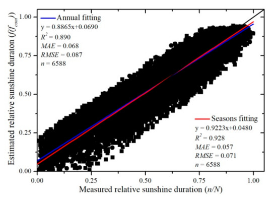 Table 4 shows the statistical performance of the proposed method for estimating sunshine duration for each meteorological station separately. For the seasonal Equations (14), the coefficient of determination (R2) range from 0.894 to 0.951, which indicates a strong correlation between measured sunshine duration and estimated sunshine duration at all stations. The RMSE value range is from 0.779 to 0.977 h/day, and the MAE value range is from 0.583 to 0.824 h/day. The RMSE at all stations is never greater than 40% of MAE, which suggests there are few outlying, inaccurate estimates of sunshine duration, according to Colaizzi [37]. The RE was lower than 0.150 at all stations, which implies good performance, according to Cai [36]. The value of d is greater than 0.960 at all stations, which, again, demonstrates good performance of the method. Figure 6 demonstrates visually that using the seasonal equations (red lines) rather than a single annual equation (blue lines) to estimate daily sunshine duration provides a better estimate since the red lines are generally closer than the blue lines to the perfect fit line shown in black.