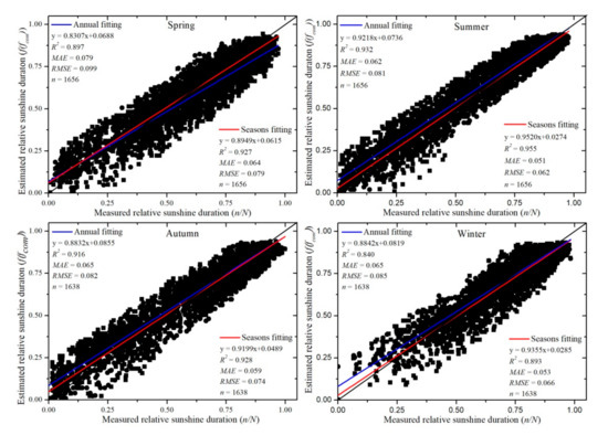 Comparisons of estimated daily relative sunshine duration by Equations (13) and (14), and measured daily relative sunshine duration at the 18 meteorological stations by season in 2016.