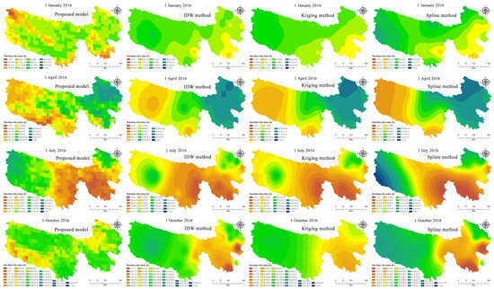 Using the FY-2G satellite data, the proposed method for estimating sunshine duration can be applied at any geographic location over Three-River Headwaters region. Accordingly, the estimated results can be compared with spatial distributions from typical interpolation methods based on data from meteorological stations. For these comparisons, four typical days were selected from different seasons in 2016 and the 18 stations in the Three-River Headwaters region were used as the base for the interpolations. In Figure 7, the first column shows the spatial distribution of sunshine duration estimated using Equation (14) from the proposed model, with the subsequent columns showing results from interpolations using, respectively, IDW (inverse distance weighting with exponent 2), Kriging (ordinary and exponential), and the spline method.