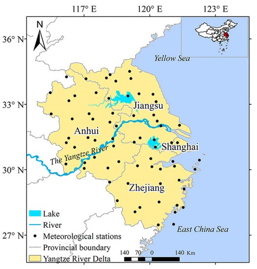 The study area includes four regions: Jiangsu Province, Anhui Province, Zhejiang Province, and Shanghai (Figure 1). The study area lies between 114°54′–122°42′ E and 27°12′–35°20′ N, and has an area of approximately 344.03 103 km2, accounting for 3.58% of China’s total land area. The area is under a monsoon climate regime, with hot and humid summer and cold and dry winter. The annual precipitation is about 1000 mm, of which the precipitation in summer accounts for two-thirds of the total precipitation []. The average temperature is close to 30 °C in July and August, and the maximum temperature recently exceeded 40 °C in Shanghai []. The high terrain is in the north and south and low terrain in the middle, which is dominated by plains and hills. In addition, the YRD is one of the most developed regions in China, with dense population, convenient transportation, and developed tertiary industry.