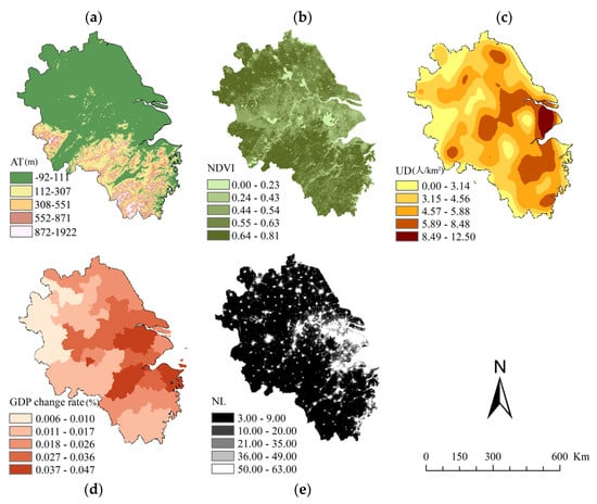 The distribution of driving factors: (a) altitude (AT); (b) normalized difference vegetation index (NDVI); (c) urban density (UD); (d) gross domestic product (GDP) change rate; (e) night light (NL).