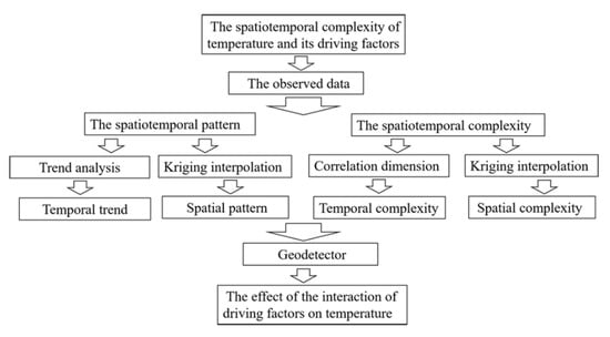 To investigate the spatiotemporal complexity of temperature and its driving factors, the correlation dimension method and the Geogdetector method were used. It can be seen from Figure 3, we first showed the spatiotemporal pattern of temperature; then, we analyzed the complexity of temperature on the daily, seasonal, and annual scales by using the Correlation Dimension (CD) method;finally, the individual contribution rates and interactional contribution rates of driving factors to the temperature slope (TS) by using Geogdetector method were detected.