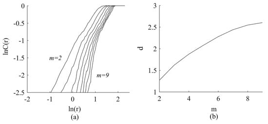 Figure 4 shows the results of ln(r) versus ln(r), and the correlation dimension (d) versus embedding dimension (m) used the measured data of temperature in this paper. It is apparent that the correlation dimension, D2, is given by the slope coefficient of ln(r) versus lnr. According to (lnr, lnC(r)), D2 can be obtained by the least squares method using a log–log grid (as shown in Figure 4a).