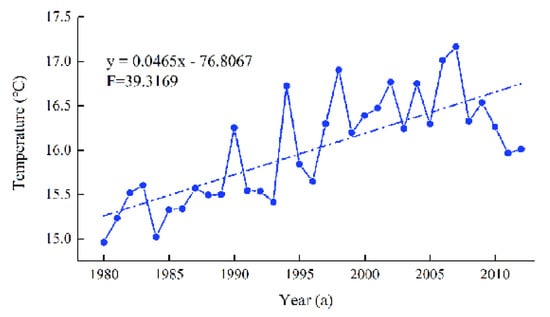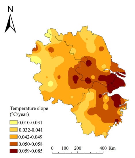 In order to understand the temperature variations during the period of 1980–2012 in the YRD, we first analyzed the overall trend of temperature variation by using the linear trend method, and the linear slope is used to identify the trend of temperature changes. If the linear slope is greater than 0, it indicates that temperature is increasing, if the linear slope is equal to 0, it means that temperature is not changing, and, if the linear slope is less than 0, it indicates that temperature is decreasing. It showed a significant increasing trend during the period of 1980–2012 (Figure 5), and this trend may continue in the future. We can see that the temperature rose 1.53 °C with the average rising rate of 0.465 °C/10 years and passed the significance test during the period of 1980–2012. However, in the most recent 50 years, the global average rising rate only has reached about 0.13 °C/10 years []. We can conclude that the increase in temperature in the YRD was not only the result of global warming, but also other regional factors.