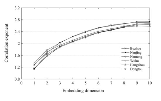 Based on meteorological data, we analyzed the chaotic dynamics with fractal characteristic for the temperature dynamics by using the G–P method []. Firstly, we randomly selected six meteorological stations (i.e., Bozhou, Nanjing, Nantong, Wuhu, Hangzhou, Dongtou) with annual time series data for a pilot study. The relationship between different embedding dimension (m) and correlation exponent (d) was shown in Figure 7.