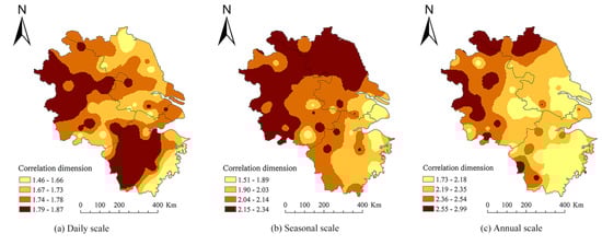 Table 1 gives the CD values of the temperature on different temporal scales, showing temperature dynamics on the daily, seasonal and annual scales. What is the spatial distribution of the CD values of different stations? We show the spatial distribution of CD values on the daily, seasonal, and annual scales (Figure 9). The ordinary Kriging method was used during interpolation, in which a spherical model is used when selecting the semi-variogram model, and its parameters are system default parameters.