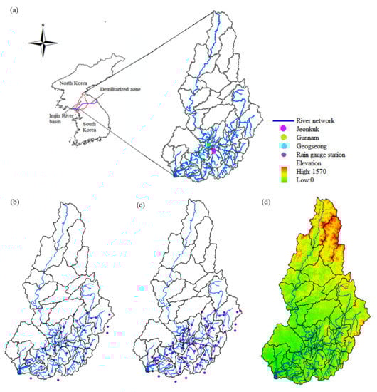 (a) The location, subbasins, network and water level of the Imjin River basin, (b) rain gauge stations in the event 2002, (c) rain gauge stations in the events 2007 and 2011 and (d) Digital Elevation Model (DEM) of the Imjin River basin.
