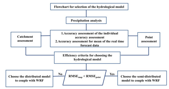 Previous studies simulated or forecasted stream flow using WRF model data that were forced to the hydrological models [21,22]. Coupling WRF with Hydrological Model for Karst Environment (HYMKE) in the Jordan River basin showed good agreement between forecasted stream flow and measured stream flow [21]. In real-time meteo-hydrological studies, one limitation of previous studies is that the time/spatial scale of the hydrological model is much finer than that of the meteorological model. Furthermore, there are few studies in the literature about the quantification of real-time forecast precipitation analysis. The last but not least. In coupled meteo-hydrological studies there is a lack of literature for choosing proper hydrological model (lumped, semi- and fully-distributed) to couple with the meteorological model. Therefore, finding a proper hydrological model to couple with the meteorological model is still an open question.