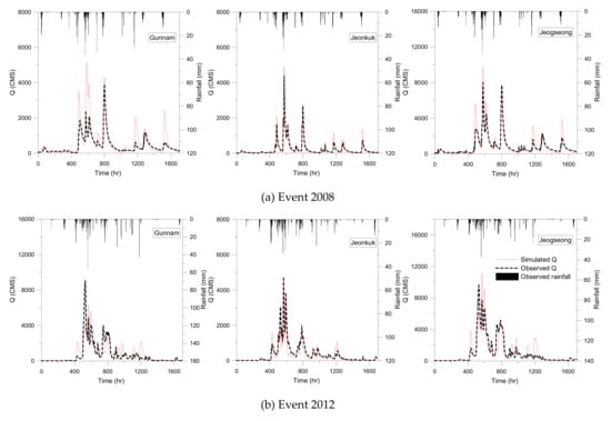 The results of the calibration (a) Event 2008 and verification (b) event 2012 of the SURR model in Gunnam, Jeonkuk and Jeogseong stations.