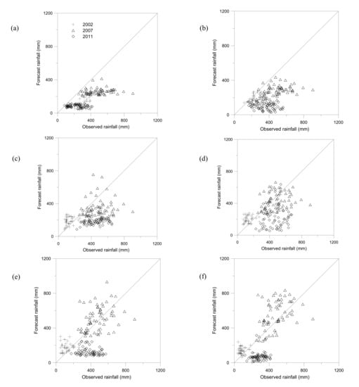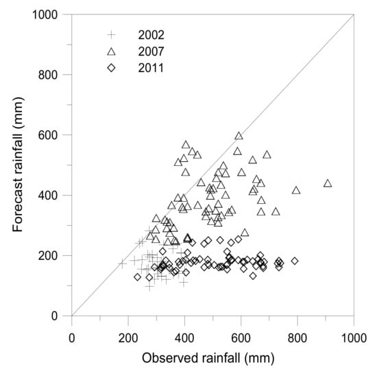 Scatter plot of observed and forecast precipitation for the events of 2002, 2007 and 2011.