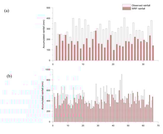 To have a general view of the meteorological models’ performance, it is of great necessity to evaluate the NWP model performance at the catchment scale. The figures demonstrate the spatial patterns of MAP, which were obtained by the observed and forecasted precipitation for each subbasin in the Imjin watershed. The observation-based MAPs were calculated using observed precipitation, while the forecast MAPs were obtained from the WRF model. The differences can be detected in the intensities of the observed data and the WRF model data in the whole area. In the flood event of 2002, there is an increasing pattern in the observed data in most of the southern region; however, the WRF model results indicated a decreasing N-S gradient and an increasing pattern in the center region. The results related to the 2007 event showed a positive northbound and southbound gradient of areal precipitation in the observed and forecasted data, respectively. In the 2011 event, the observed and WRF data had an increasing pattern of rainfall from North to South while the WRF results included an underestimation for the MAP. Taken together, at the catchment scale, the WRF model predicted the general rainfall pattern well; however, it had some significant underestimation with respect to the observations (Figure 7).