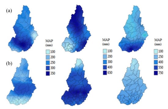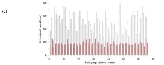 The results of MAP analysis for 38 subbasins exhibited that the WRF model had better performance for the 2002 event, with a lower RMSE of 122 than the higher RMSE of 159 and 304 for the 2007 and 2011 events, respectively (Table 9). Overall, the spatial averaging of rainfall over the catchment reduces the errors compared to point analysis. The accuracy assessment for the comparison of forecast precipitation and MAP indicated that significant differences can be expected for distributed and semi-distributed hydrological models. According to the findings, the semi-distributed hydrological model may be a better choice for this study. For the SURR model, as a semi-distributed hydrological model used in this study, better forecast stream flow can be expected as a result of the lower RMSE in MAP than that from the point precipitation accuracy assessment.