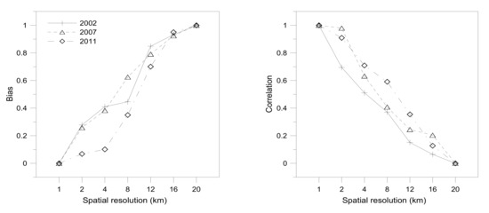 The bias and correlation assessment for the different spatial resolutions in events 2002, 2007 and 2011.