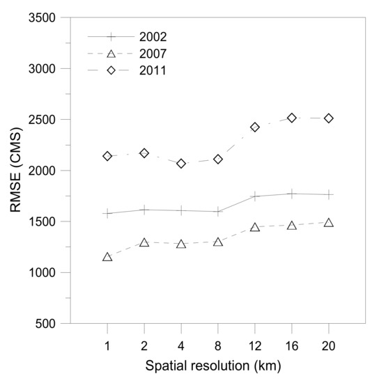 Comparison of forecast flow RMSE for different spatial resolutions in events 2002, 2007 and 2011.