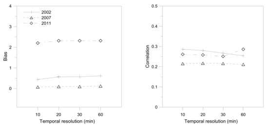 The bias and correlation assessment for the different temporal resolutions of events 2002, 2007 and 2011.